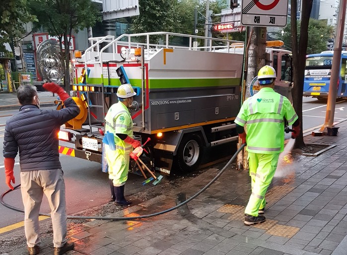 ▲신림역 일대에서 미세먼지 도로 청소를 실시하고 있다.(관악구 제공) |