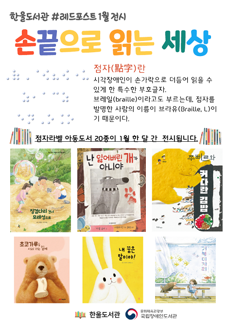 [로컬세계 = 이영원 기자]경기 파주시 한울도서관은 1월 한 달간 한울도서관 로비에 위치한 서가 ‘#레드포스트’에 시각장애아동용 점자라벨도서 20종을 전시한다.