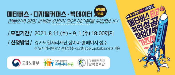 [로컬세계 김병민 기자]경기 수원시가 성균관대학교와 협력해 진행하는 ‘디지털커머스 전문인력 양성 지원사업’ 참여자 모집 기간을 9월 1일까지 연장한다.