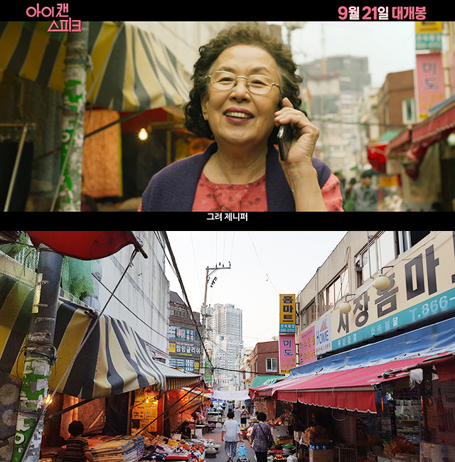 영화 '아이 캔 스피크' 메인 예고편에 극 중 '봉원시장', 실제 부산 '연산시장'을 배경으로 나문희가 이제훈과 통화를 하는 장면이 공개됐다.