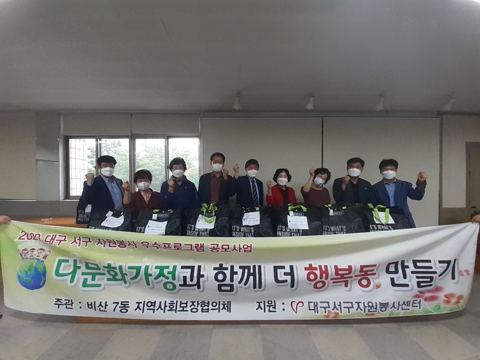 [로컬세계 박세환 기자]대구 서구 비산7동 지역사회보장협의체(위원장 홍세의)에서는 지난 15일 코로나19로 어려움을 겪고 있는 다문화가정 15세대에 생필품과 학용품이 담긴 선물꾸러미(50만원 상당)를 전달했다.