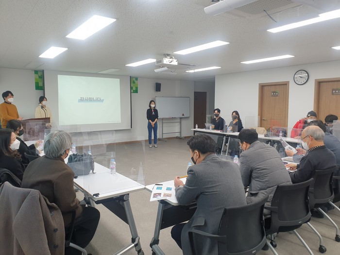 ▲지난달 27일 이웃사촌지원센터에서 2021년 청년시범마을 일자리사업 참여자 중간점검 회의 모습. 의성군 제공 |