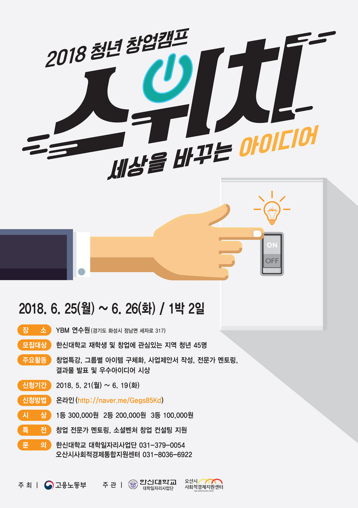 [로컬세계 주덕신 기자]경기도 오산시 사회적경제지원센터와 한신대학교 대학일자리사업단이 공동주관하는 '2018 오산 청년 창업캠프'가 오는 25~26일 2일간 YBM 연수원에서 진행한다.