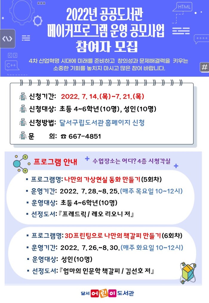 달서어린이도서관은 지난 6월 문화체육관광부에서 주최하는 '2022년 공공도서관 메이커프로그램 운영지원' 공모사업에 선정됐다. 공모사업 선정으로 책과 IT기술이 융합된 메이커프로그램을 운영한다.