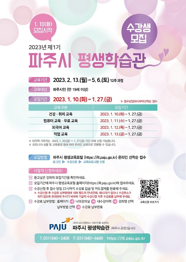 [로컬세계 = 이영원 기자]경기 파주시(시장 김경일)는 오는 10일부터 27일까지 2023년 제1기 파주시 평생학습관 수강생 1,597명을 모집한다.