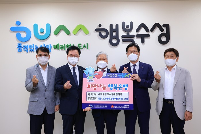[로컬세계 박세환 기자]대구 수성구는 지난 9일 새마을금고 수성구협의회가 제1회 지역상생의 날(5월 25일)을 맞아 어려운 이웃을 위해 써달라며 성금 200만원과 에코백 50개를 구청에 전달했다고 10일 밝혔다.