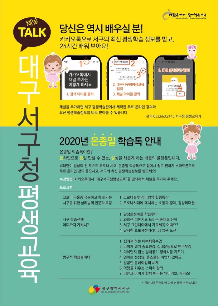 [로컬세계 박세환 기자]대구 서구청은 비대면이 일상이 된 코로나19 상황에 맞춰 많은 구민들이 쉽고 편리하게 평생학습강좌와 관련 정보를 접할 수 있도록‘대구서구청 평생교육’카카오톡 채널을 운영한다.