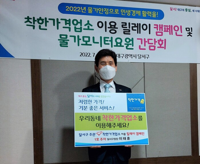 이태훈 달서구청장은 “최근 물가상승의 문제해결을 위해 중앙정부 뿐만 아니라 지역 차원에서도 함께 노력해 나갈 필요가 있다. 공공기관, 직능단체를 중심으로 물가모범업소인 착한가격업소 이용함으로써 물가안정 분위기를 확산하고, 골목상권 활성화에도 도움이 되는 이번 릴레이 캠페인이 달서구 전역, 전국으로 확대되기를 바란다”고 말했다.