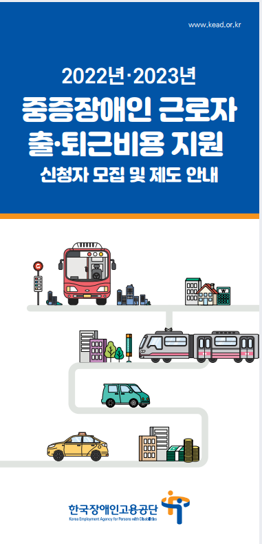 중증장애인근로자 출퇴근 비용지원 사업은 저임금 중증장애인 근로자에게 출퇴근 비용을 지원하여 근로의욕을 고취하고 안정적인 직업생활 유지를 위한 교통비 매월 5만원 한도 내에서 비용을 지원하는 사업이다.