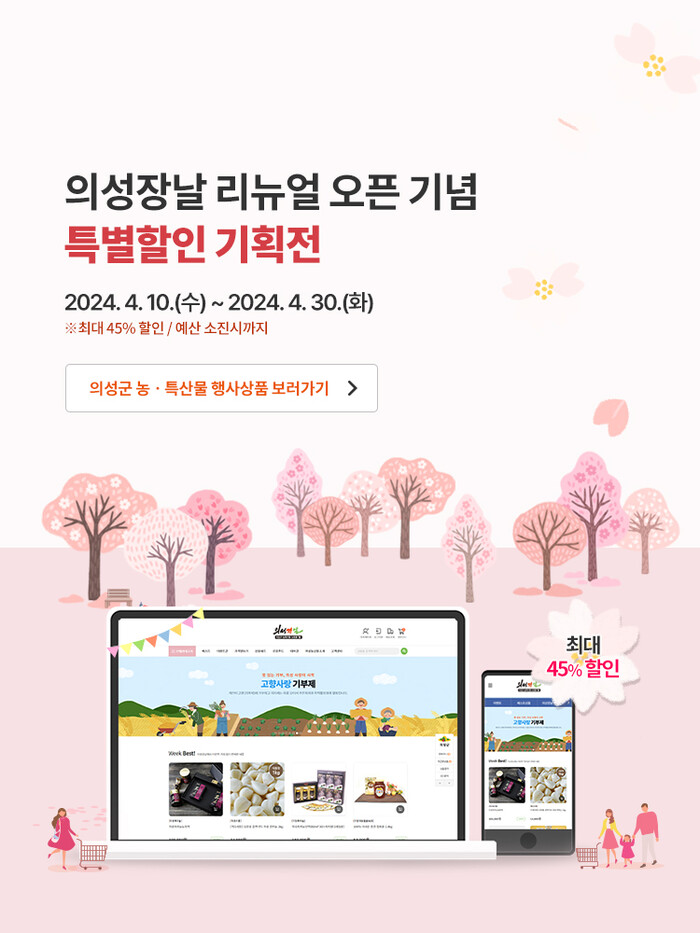 이에 따라 오는 4월 30일까지 의성장날 새단장 기념 고객감사 기획전을 추진, 전 품목 최대 45% 할인 프로모션을 진행하며 1년이상 구매이력이 없는 비활동 회원을 대상으로 5천원 할인쿠폰을 지급한다.