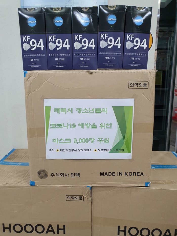 [로컬세계 박상진 기자]강원 태백시는 대한석탄공사 태백 장성광업소와 장성광업소 노동조합이 지난달 25일 태백시청소년수련시설에 마스크 3000장을 후원했다고 2일 밝혔다.