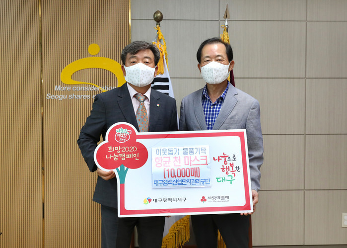 [로컬세계 박세환 기자]대구염색산업단지관리공단은 지난 25일 서구청을 방문해 코로나19로 어려움을 겪고 있는 취약계층 세대를 위해 항균 천 마스크 1만매를 전달했다.