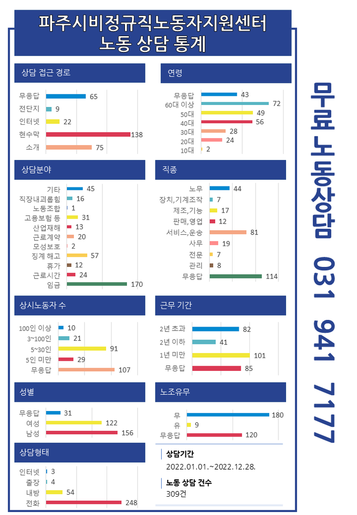 상담은 전화상담 248건, 방문 상담 54건, 인터넷 3건, 출장 4건 총 309건으로, 상담 접근 경로는 현수막 138건, 주변 소개 75건 순으로 나타났으며, 상담자의 연령대는 절반가량이 50대 이상이었고, 노동조합이 없는 경우가 180건이었다.