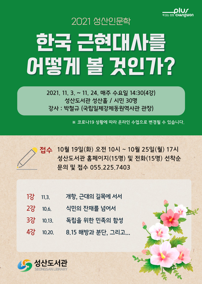 강좌는 11월 3일부터 24일까지 매주 수요일 오후 2시 30분에 운영되며, 첫 강의 ‘개항, 근대의 길목에 서서’를 시작으로 총4회 진행된다. 강좌 신청은 성산도서관 홈페이지(15명) 및 전화(15명)로 할 수 있으며 수강료는 무료이다.