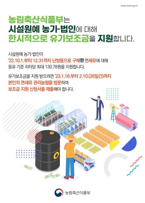 지원 대상은 농협에 농업기계 보유현황 및 난방기 재배계획 신고를 하고, 면세 유류 구매 카드를 발급받은 시설원예 농가·법인으로, 2022년 10월 1일부터 12월 31일까지 사용한 면세유를 지원하며, 난방용 면세유 구매분에 대해 보조금 지원신청서를 제출하면 지원금을 받을 수 있다.