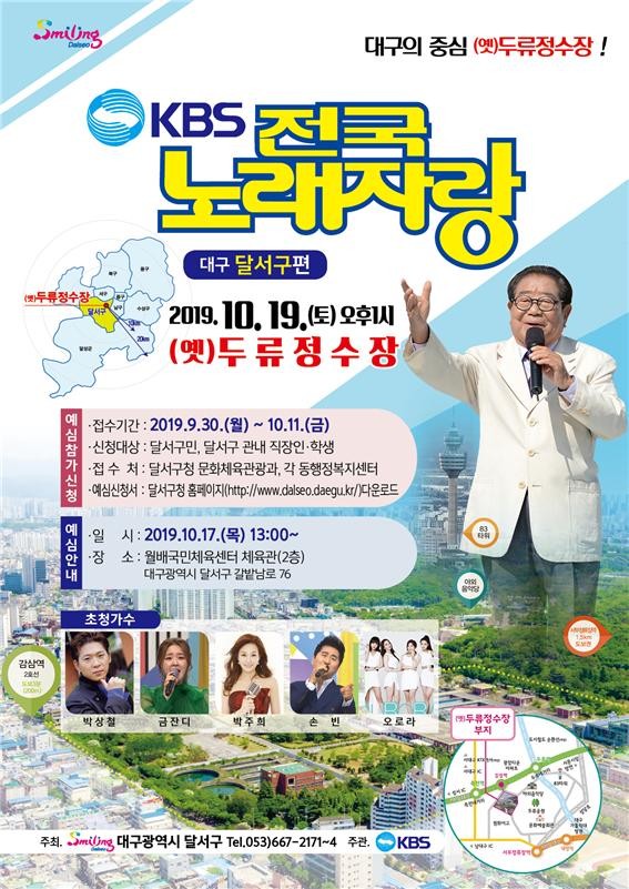 예심신청은 오는 11일까지이며, 17일 오후 1시 월배국민체육센터 체육관에서 치열한 예심 경연을 거쳐 19일 15개 팀이 ‘KBS전국노래자랑’ 대구 달서구편 본선에 도전한다.