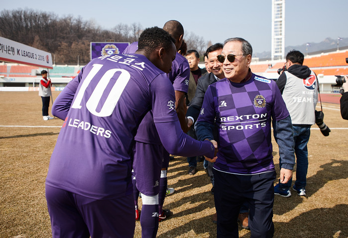 ▲쌍용자동차 최종식 대표이사(사진 가운데)가 11일 안양종합운동장에서 열린 2018 K리그2 FC 안양 홈개막전에서 선수들과 인사를 나누고 있다. |