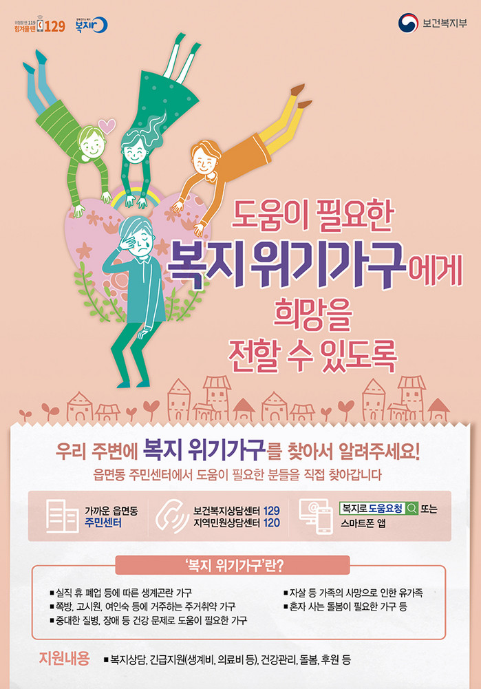 박민철 복지정책과장은 “주위에 어렵거나 도움이 필요한 이웃이 있다면 해당 읍·면·동 주민센터 또는 129긴급 콜센터로 제보해주길 바란다”며 “겨울철 한파에 더욱 어려운 이웃들을 위해 민·관이 힘을 합쳐 적극 도울 것”이라고 밝혔다.