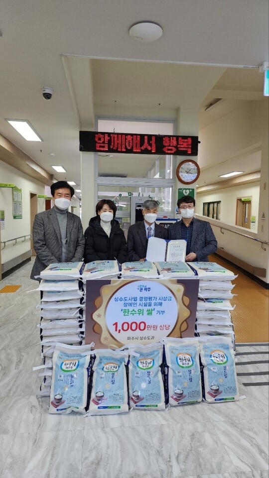 [로컬세계=이영원 기자]경기 파주시(시장 김경일)가 2021년 행정안전부 주최 ‘전국 상수도 경영평가’에서 최우수 등급으로 선정돼 부상으로 받은 포상금으로 1000만원 상당의 한수위 파주쌀 334포대를 파주시 장애인 종합복지관 등 6개 시설에 기탁했다.