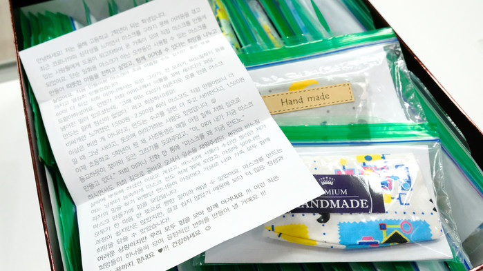 이 편지에는 ”코로나19의 심각성을 느끼면서 마스크를 구하지 못해 어려움을 겪고 있는 사람들에 도움이 되고자 온 가족이 모여 직접 마스크를 만들게 됐다“며 ”오래 사용할 수 있는 마스크를 만들어 따듯한 마음을 전하고, 함께 이겨낼 수 있다는 희망을 나누고 싶다“고 적혀있었다.