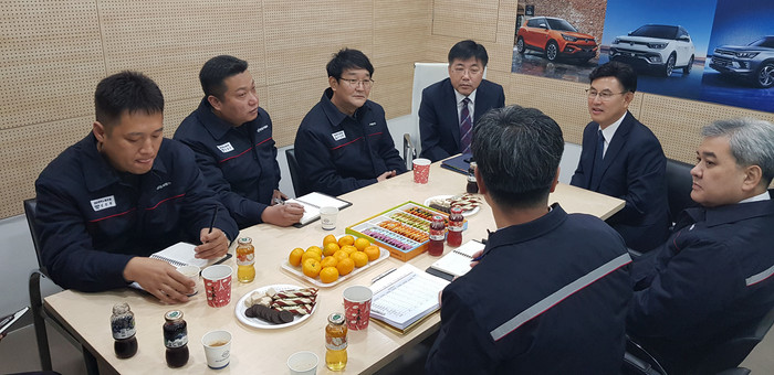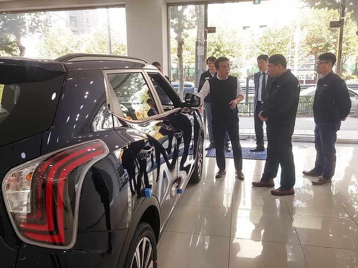 | ▲쌍용자동차 품질 혁신 노사 공동 TFT 관계자들이 지난 7일 쌍용자동차 부천소사대리점을 방문해 차량을 둘러보며 판매 현황을 듣고 있다. |