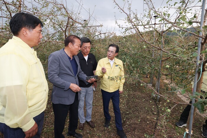 ▲ 이성희 농협중앙회장(오른쪽에서 두번째)은 13일 충북 제천시 소재 우박피해농가를 방문해 피해상황을 점검하고 있다. 농협 제공 |