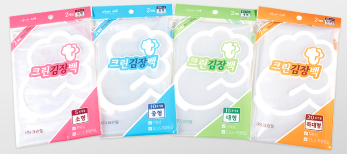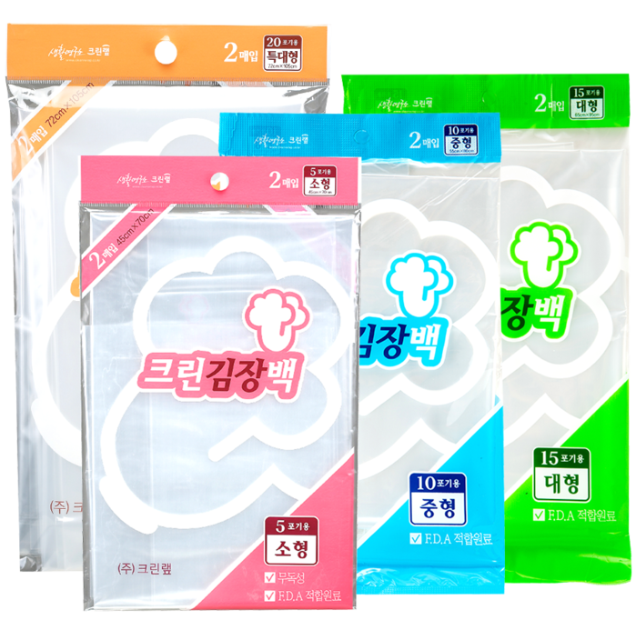 크린랲 김장백은 △배추 5포기용 소형 △10포기용 중형 △15포기용 대형 △20포기용 특대형 4가지 사이즈로 분류되어 필요한 크기대로 골라 사용할 수 있다. 두꺼운 고급 비닐 재질로 반찬 용기에 김치 냄새가 배는 것을 막아주고, 크린장갑과 마찬가지로 FDA 승인을 받은 원료로 국내 제작되어 안전성과 품질을 믿을 수 있다.