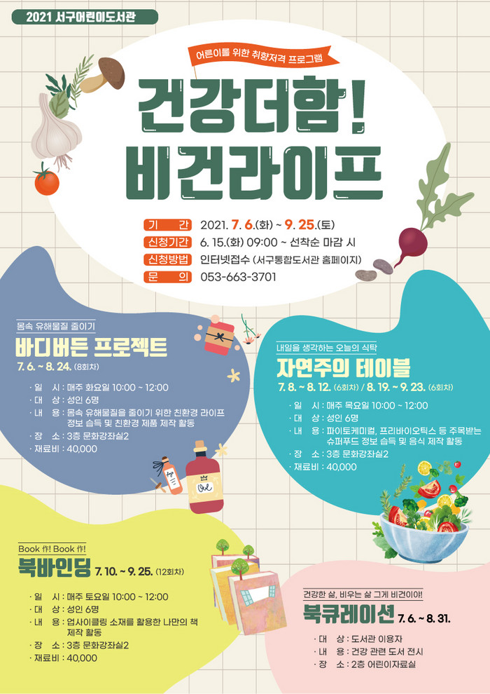 [로컬세계 박세환 기자]대구 서구어린이도서관은 오는 7월 6일부터 9월 25일까지 어른이 취향저격 문화 프로그램으로 “건강더함! 비건라이프”를 새롭게 운영한다고 10일 밝혔다.