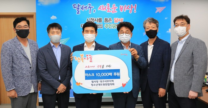 [로컬세계 박세환 기자]대구 달서구는 법사랑 대구서부지역연합회 청소년계도위원협의회에서 지난달 30일 달서구청을 찾아 마스크 1만매(550만원 상당)를 전달하고 지역사회와 함께 코로나19 극복에 적극 동참할 것을 약속했다고 1일 밝혔다.
