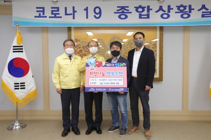 [로컬세계 박세환 기자]대구 수성구의회 친목회(회장 황기호)는 30일 수성구청 종합상황실을 방문해 코로나19 극복을 위한 성금 255만768원을 전달했다.