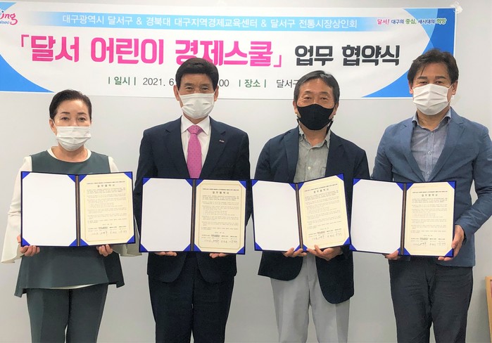 [로컬세계 박세환 기자]대구 달서구는 지난 3일 구청 회의실에서 '달서 어린이 경제스쿨'운영을 위해 경북대 대구지역경제교육센터(센터장 오영수) 및 전통시장 상인회(월배시장 손병식 회장, 와룡시장 윤선주 회장)와 업무협약을 체결했다고 4일 밝혔다.