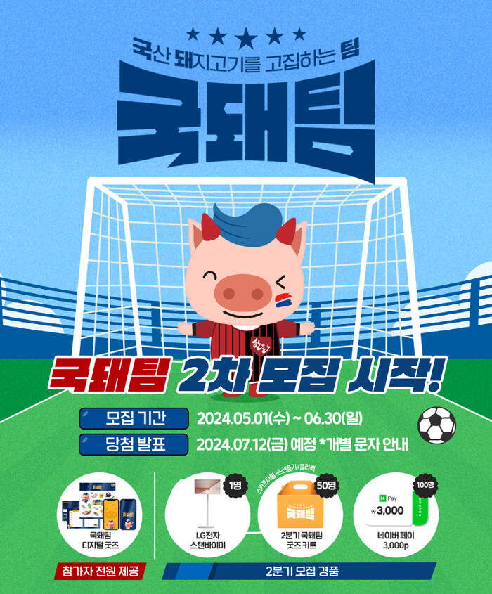 한돈자조금관리위원회(이하 한돈자조금)이 전 국민을 대상으로 한돈을 사랑하는 사람이라면 누구나 참여할 수 있는 ‘2024 국돼팀(국산 돼지고기를 고집하는 팀) 연중 캠페인’을 펼치고 있는 가운데, 지난 1일부터 국돼팀 2분기 모집을 시작했다.