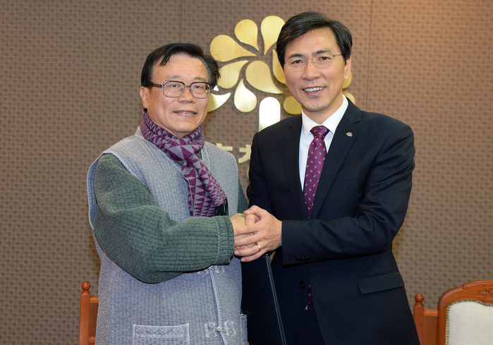 | ▲ 위촉식 전달 후 안희정(오른쪽) 지사와 이동필(왼쪽) 전 농림식품축산부 장관이 악수하고 있다. |
