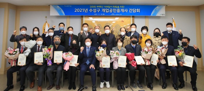 수성구는 지역사회 발전을 위해 헌신적으로 봉사한 개업공인중개사에 표창장을 수여 했다. 이들은 행복나눔 무료중개서비스 등 부동산 중개업을 모범적으로 운영하고, 건전한 부동산 거래 질서 확립에 기여했다.