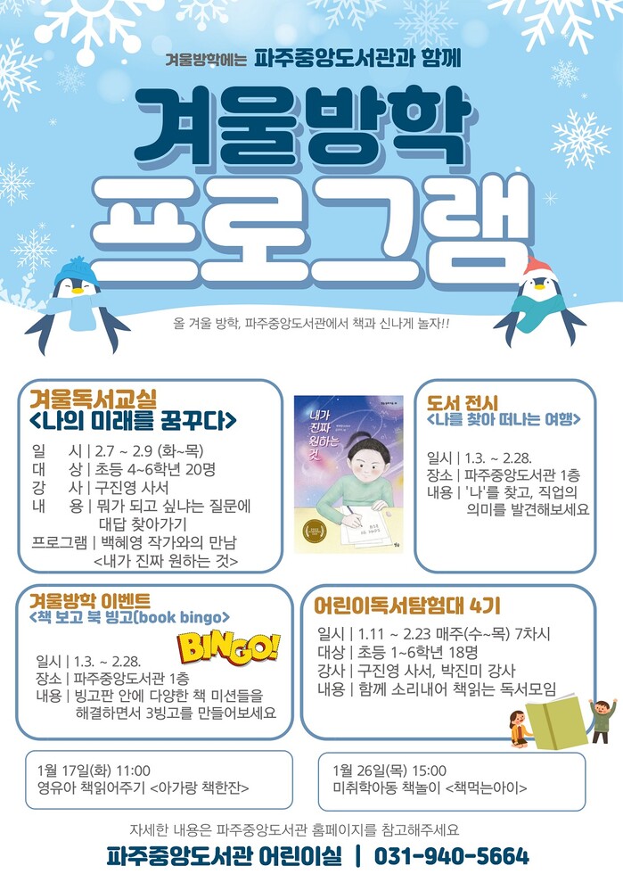 [로컬세계 = 이영원 기자]경기 파주중앙도서관은 겨울방학을 맞아 2월 28일까지 아이들이 즐길 수 있는 다양한 독서프로그램을 운영한다.