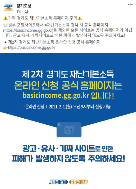 [로컬세계 고기훈 기자]경기도가 코로나19로 인한 경제위기 극복을 위해 모든 도민에게 1인당 10만원씩 지급하는 ‘2차 재난기본소득’ 신청이 2월 1일 시작될 예정인 가운데 핸드폰 번호를 요청한 후 소액결제 방식으로 돈을 빼가는 가짜 신청사이트가 적발돼 도가 적극 대응에 나섰다.