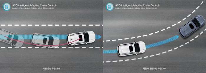 ▲고속도로 및 일반도로에서도 작동하는 지능형주행제어시스템(IACC). 사진은 차선 중심 추종제어(왼쪽), 차선 내 추종 제어. |