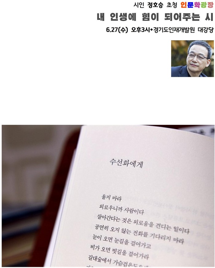 김익호 경기도인재개발원장은 “인문학광장이 공무원의 공감능력을 향상시켜 행정역량을 높이는데 큰 도움이 되고 있다”며 “문화예술강연이라는 새롭고 흥미 있는 교육 방식을 계속 도입해 21세기가 요구하는 창의적 인재를 양성하겠다”고 전했다.