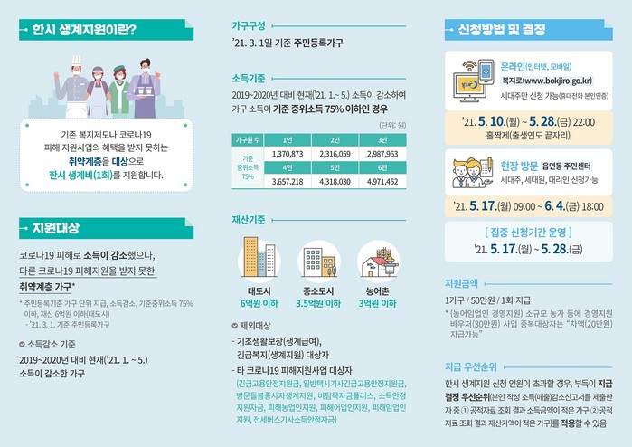 지원 대상은 기존 생계급여‧긴급복지(생계지원) 수급자, 2021년 코로나19 재난지원금(버팀목자금, 긴급고용안정지원금 등) 중복지원자를 제외하고 소득감소 등 위기가 발생했으나, 다른 코로나19 피해 지원을 받지 못하는 저소득층 가구를 대상이다. 가구원 소득 합이 기준 중위 소득(4인가구, 365만7218원) 75% 이하, 재산기준 3억5000만원이하 대상 중 현재(1~ 5월) 소득이 감소한 가구이다.