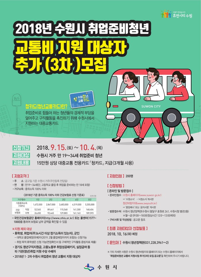 이번 추가모집 지원대상은 수원시에 거주하면서 취업을 준비하는 만 19~34세 청년으로 중위소득 100% 이하(건강보험료 산정 기준)인 가구의 세대원이 신청할 수 있다.
