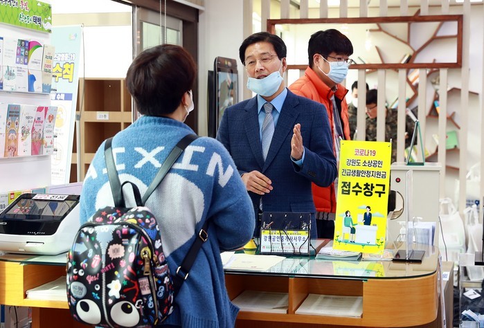 ▲류태호 시장이 지난달 1일 강원도 소상공인 긴급생활안정지원금 접수 창구를 찾은 소상공인의 어려움을 듣고 있다.(태백시 제공) |
