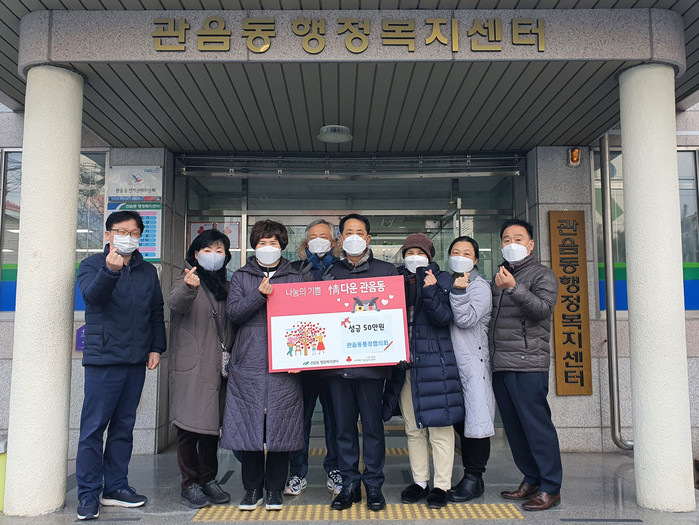 김재은 동장은 “매서운 한파속에서도 이웃사랑을 실천하는 관음동 통장협의회에 깊은 감사를 드린다. 기탁하신 성금은 저소득 독거어르신에게 소중히 전달하도록 하겠다”고 말했다.