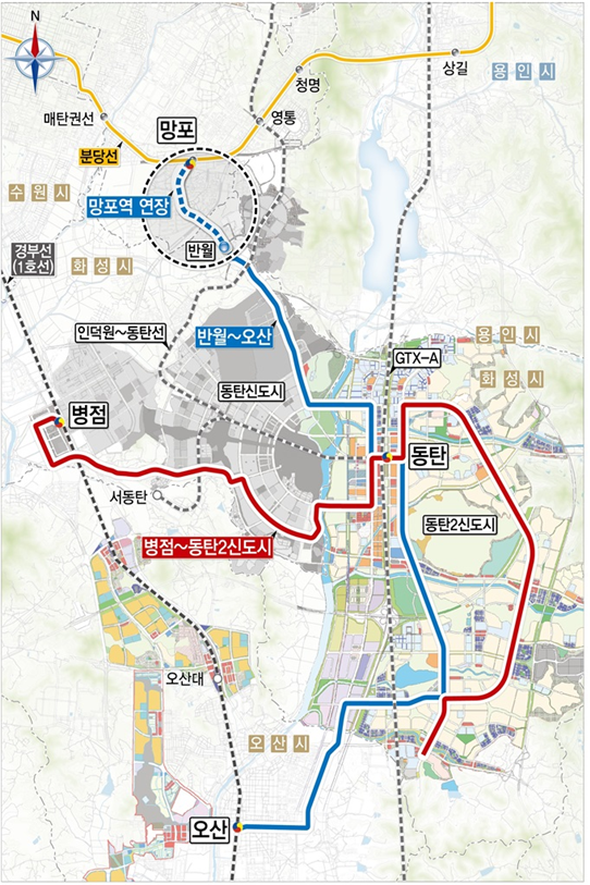 또한 분당선(망포역), 1호선(오산역, 병점역), GTX-A·SRT(동탄역) 등 주요 철도망의 환승역과 연계돼 동탄 신도시 주민은 환승을 통해 서울 삼성역까지 평균 35분대 도달할 수 있다.