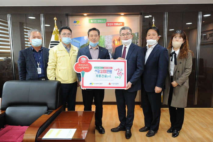 [로컬세계 박세환 기자]대구 남구는 지난 16일, 계룡건설(주)(대표이사 한승구)에서 코로나19 극복을 위해 성금 3000만원을 전달했다고 17일 밝혔다.
