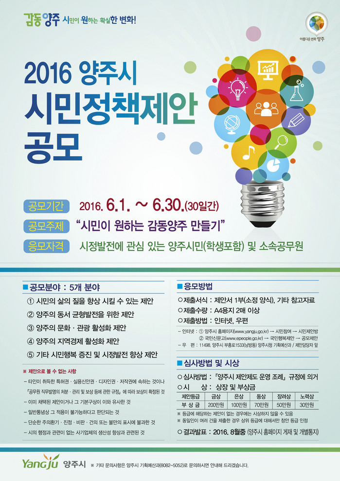 분야는 ▲시민의 삶의 질을 향상 시킬 수 있는 제안 ▲양주의 동서 균형발전을 위한 제안 ▲양주의 문화·관광 활성화 제안 ▲양주의 지역경제 활성화 제안 ▲기타 시민행복 증진 및 시정발전 향상 제안이다.