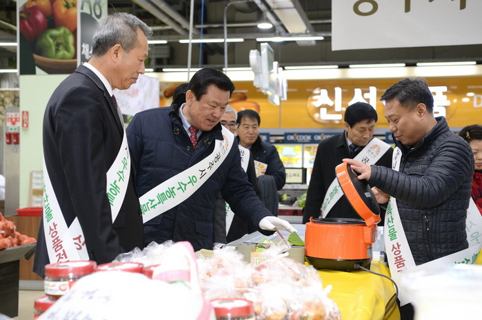 ▲오시덕 공주시장(좌측2번째)이 2018년 신년맞이 고맛나루 농특산물 홍보판촉전을 둘러 보고 있다. |