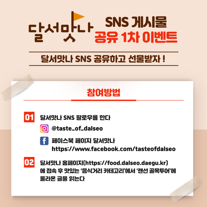 SNS공유이벤트는 누구나 참여가 가능하며 달서맛나 SNS를 팔로우하고 달서맛나 홈페이지 접속 후 ‘맛있는 음식거리’ 카테고리에서 ‘랜선 골목투어’에 올라온 글을 캡쳐해서 필수 해시태그와 함께 개인 SNS에 공유하고 달서맛나 SNS에 참여완료 댓글을 달면 된다.