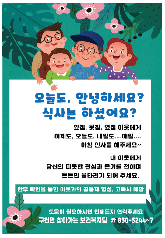 1가구가 최소 4가구의 안부를 확인하고 1가구에 최소 4가구의 이웃이 방문함으로써 의미 없어 보이는 간단한 인사가 이웃에 대한 관심을 증대시켜 1인 가구의 고독사를 예방하고, 복지사각지대를 발굴할 수 있다는 취지에 구천면은 사업을 계획하고 경로당 순회 및 각종 행사 시에 홍보하고 있다.