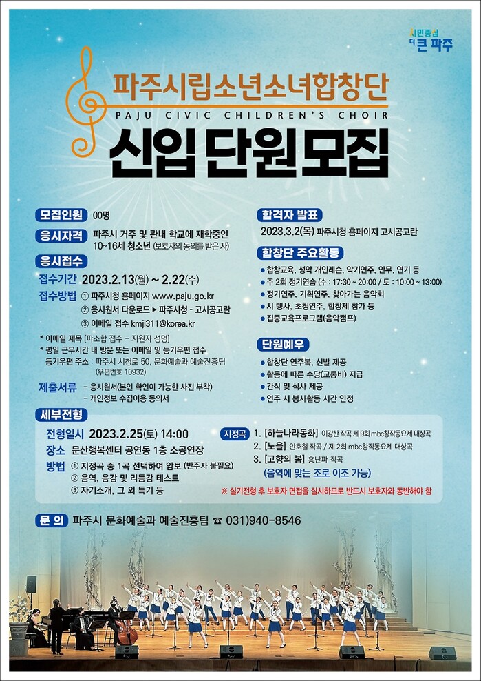 [로컬세계 = 이영원 기자]경기 파주시립소년소녀합창단이 2023년 신규단원 16명을 모집한다.
