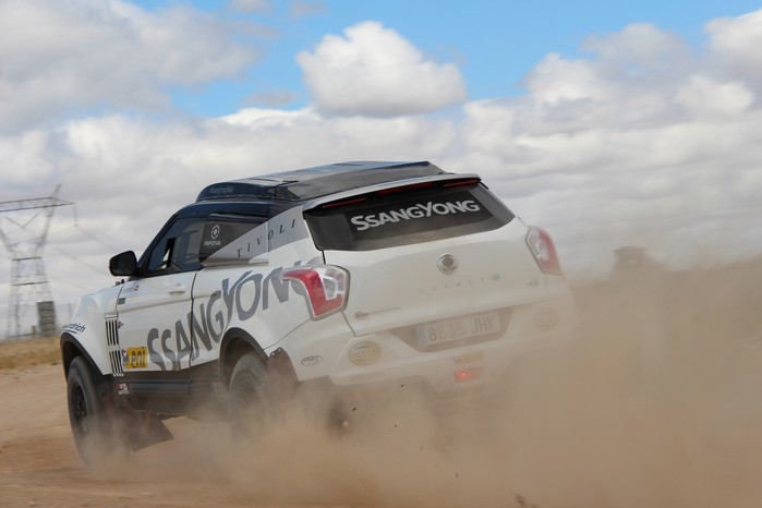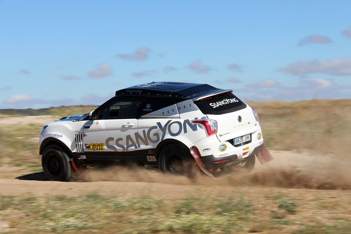 ▲쌍용차는 내년 죽음의 레이스라 불리는 다카르 랠리에서 포디움 입성을 목표로 하고 있다. 사진은 지난달 5일 스페인 에스트레마두라(Extremadura) 지역에서 열린 미디어 행사에서 시범 주행 중인 티볼리 랠리카. |